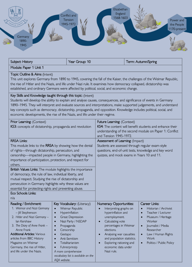 Found below, are our Learning Journey documents for each year group outlining the programme of study, our Intent statements, information about how the subject will be taught, how it links with other subjects and how parents can support students to be successful.